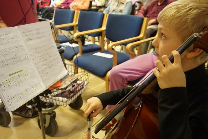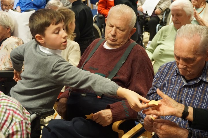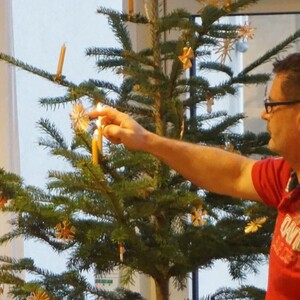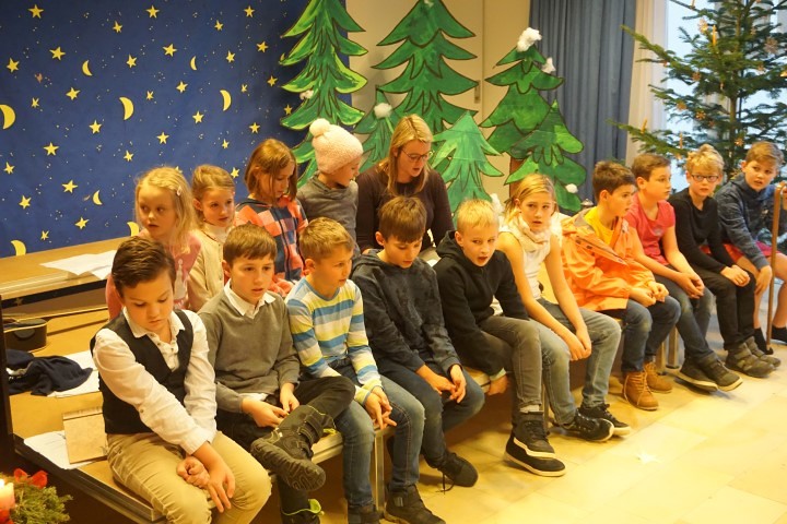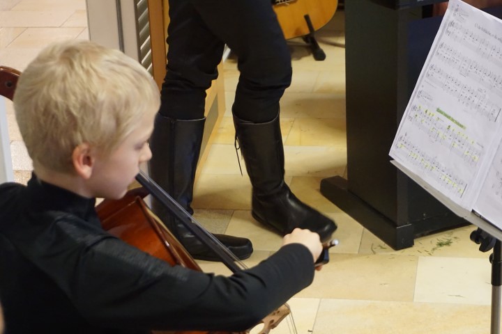 Die Kerzen des Christbaums werden entzündet, Judith Mair am Klavier und Elias Zauner am Cello begleiten die gemeinsam gesungenen Weihnachtslieder.