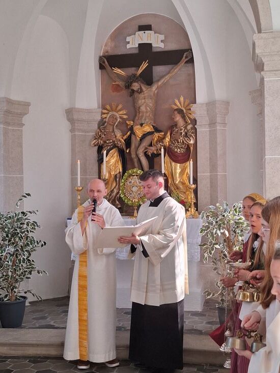 Nach einem feierlichen Wortgottesdienst, durch Walter Lamplmayr zelebriert, zog die Pfarrgemeinde, begleitet von der Musikkapelle zu den einzelnen Altären im Gemeindegebiet.