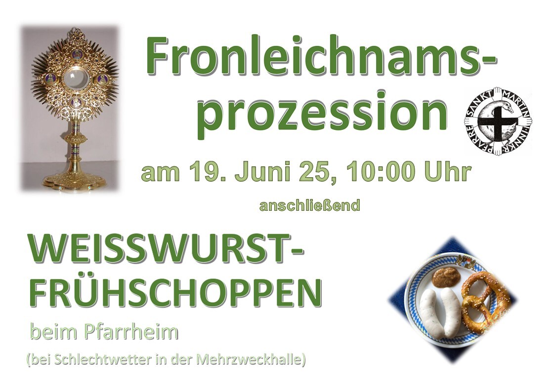 Nach der Fronleichnamsprozession lädt die Pfarre alle sehr herzlich zum "Weißwurstfrühschoppen" beim Pfarrheim ein.